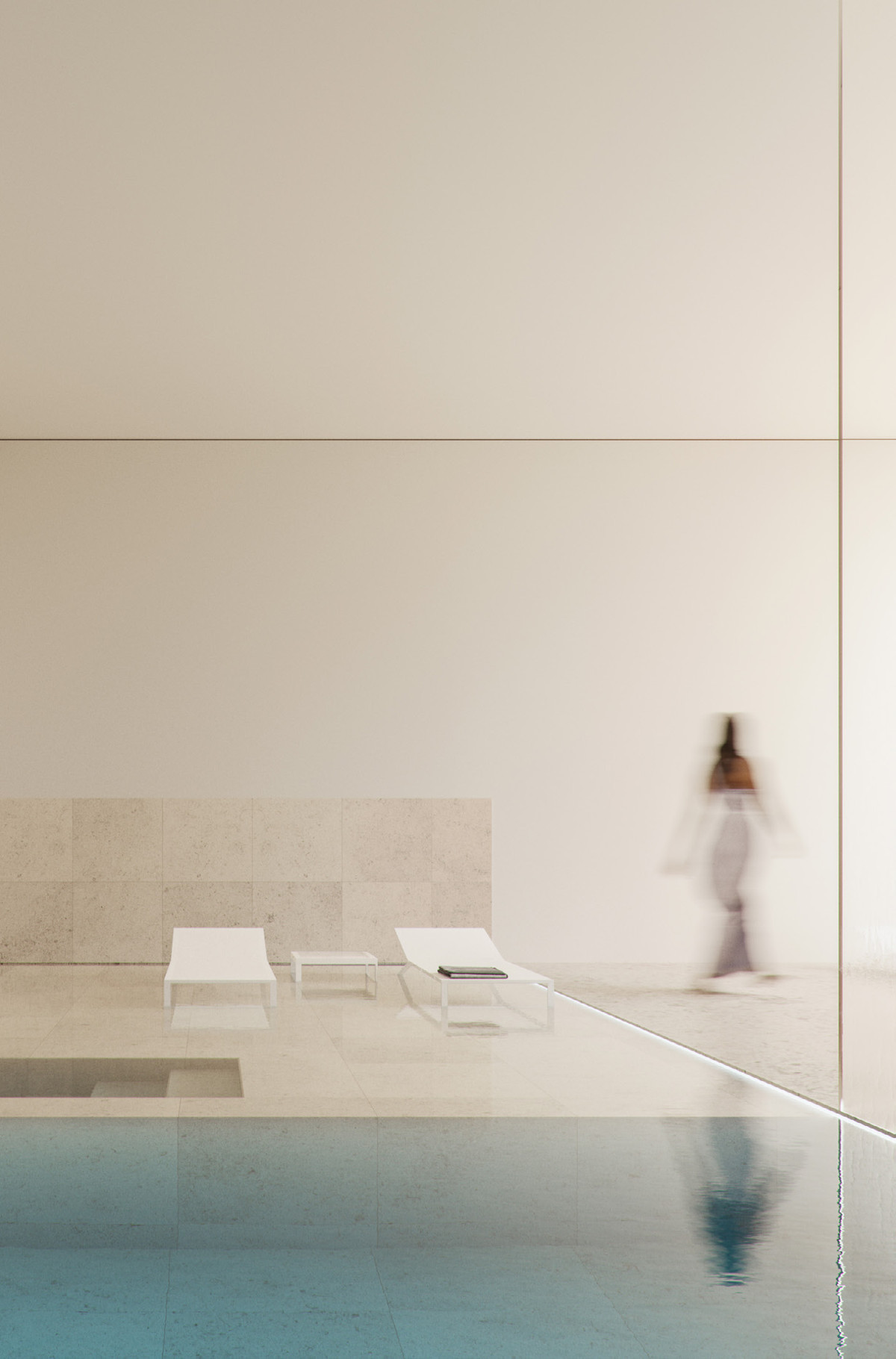 The basement of this villa features a heated indoor swimming pool, illuminated by sophisticated LED lighting, providing a warm and inviting space for relaxation, no matter the season.